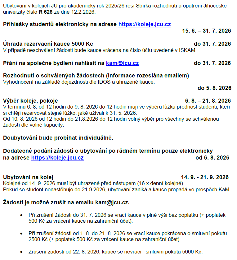 Harmonogram ubytování 2026 - 2027